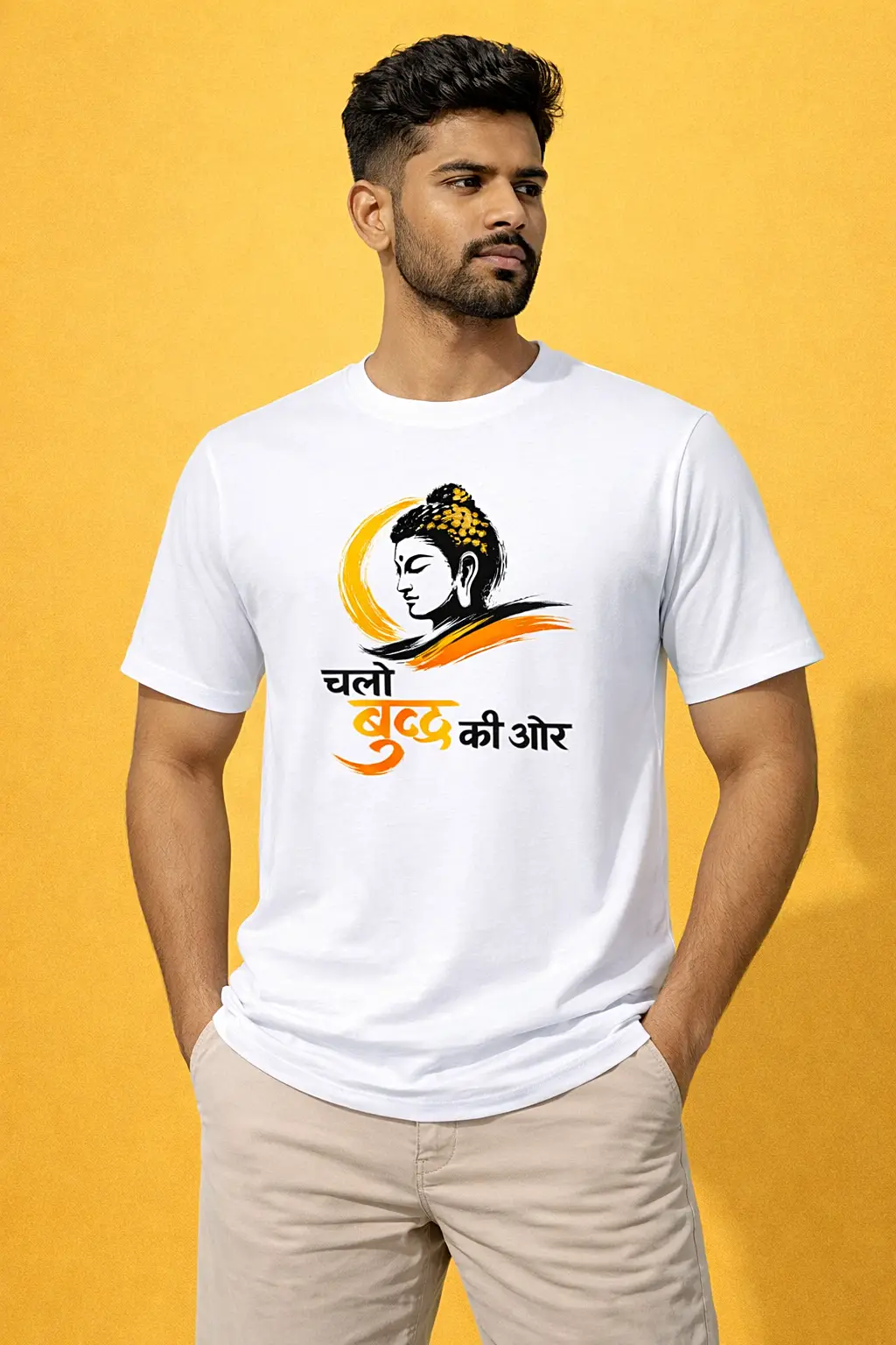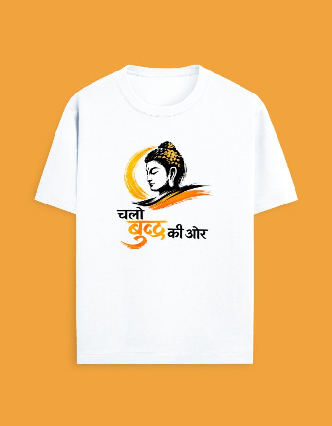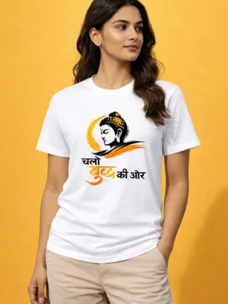 Express peace, wisdom and inner awakening with this “चलो बुद्ध की ओर” Buddha T-shirt. The design features a calm Buddha illustration with artistic brush strokes and a powerful Hindi message that inspires people to move towards Buddha’s path of wisdom and compassion.