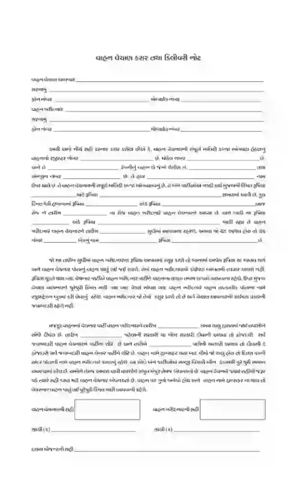 This ready-to-use ‘Sale Agreement & Delivery Note’ is specially designed in Gujarati for buying or selling any second-hand vehicle (bike, car, or other). It helps both buyer and seller to complete the deal with proper legal safety